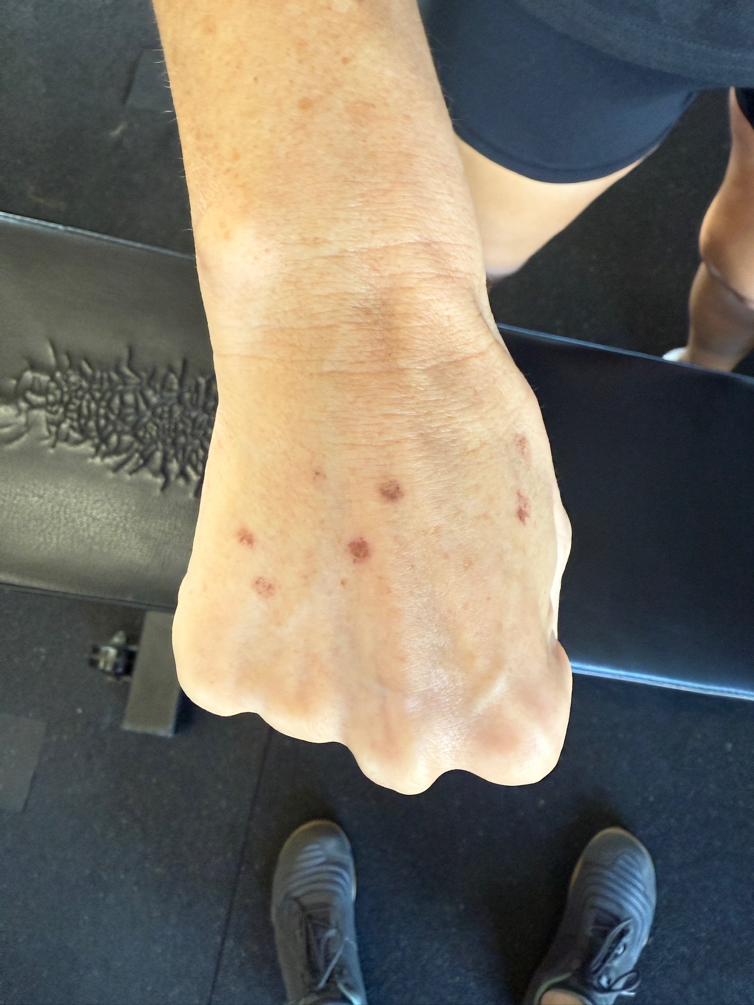 Cherry angiomas often develop on the chest, back, arms, neck, and face, and tend to increase with age. While medically harmless, many clients choose removal for cosmetic comfort or irritation caused by clothing.